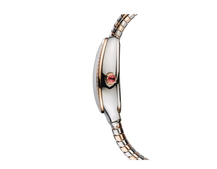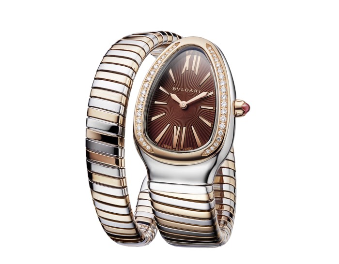 Combining two iconic design elements of BVLGARI, the SERPENTI TUBOGAS watch interweaves the sinuous shape of the snake with the modern atmosphere of the TUBOGAS metal hose. The timepiece uses this unique technology to create symmetrical lines in the shape of a flexible and soft metal tube, which symbolizes the graceful curves of women and the agile posture of the snake. This watch exudes elegance, charm and personality, opening a new chapter in the SERPENTI series. SERPENTI TUBOGAS watch, equipped with quartz movement, 35 mm diameter stainless steel curved case, 18K rose gold bezel set with brilliant-cut diamonds, 18K rose gold crown set with a cabochon-cut rubellite, brown dial decorated with Single-turn bracelet in stainless steel and 18K rose gold with sunray guilloché decoration.